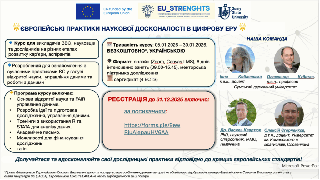 Раді оголосити про відкриття реєстрації на навчальний курс “ЄВРОПЕЙСЬКІ ПРАКТИКИ НАУКОВОЇ ДОСКОНАЛОСТІ В ЦИФРОВУ ЕРУ” 📅 Тривалість курсу: 05.01.2026 – 30.01.2026, БЕЗКОШТОВНО*, УКРАЇНСЬКОЮ 🎓 Формат навчання: онлайн