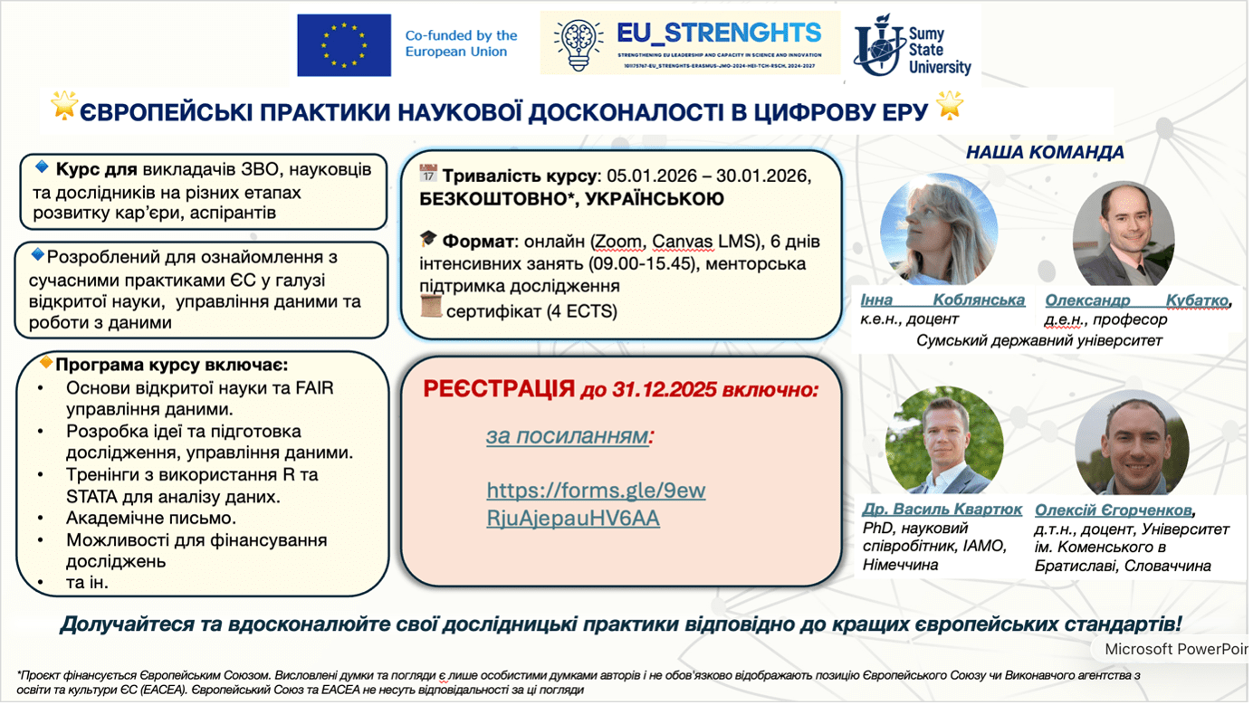 We are pleased to announce the opening of registration for the training course “EUROPEAN PRACTICES OF SCIENTIFIC EXCELLENCE IN THE DIGITAL ERA”