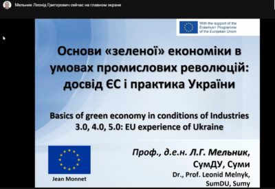 Within the course of Economics of Enterprise, Doctor of Economics, Leonid G. Melnyk, Professor at the Department of Economics, Entrepreneurship and Business Administration together with Ph.D. Associate Professor at the same Department conducted a social module “Green Economy in Industries 3.0 and 4.0: the EU’s experience and the practice of Ukraine” for first-year students majoring in “Economics and Business”.