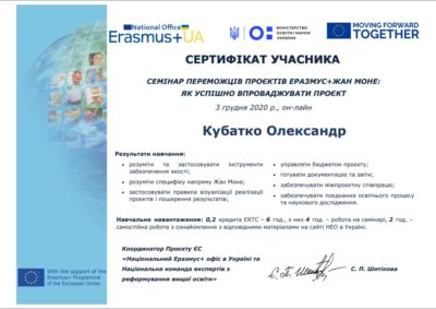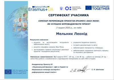 3 грудня 2020 р. на платформі ZOOM Національний Еразмус+ офіс в Україні провів он-лайн заход «ДЕНЬ ПЕРЕМОЖЦІВ ПРОГРАМИ ЄС ЕРАЗМУС+ НАПРЯМ ЖАН МОНЕ: як успішно впроваджувати проєкт». Захід було організовано Національним Еразмус+ офісом в Україні спільно з Міністерством освіти і науки України та за підтримки Представництва Європейського Союзу в Україні. Від кафедри економіки, підприємництва та бізнес-адміністрування прийняли участь Мельник Леонід, керівник кафедри Жана Моне «Законодавчий, економічний та соціальний перехід ЄС до сталого суспільства в межах Індустрії 4.0 та 5.0» (619997-EPP-1-2020-1-UA-EPPJMO-CHAIR) та Кубатко Олександр, керівник кафедри Жана Моне «Кафедра Жана Моне по економічній політиці ЄС та громадянському суспільстві» (619878-EPP-1-2020-1-UA-EPPJMO-CHAIR).