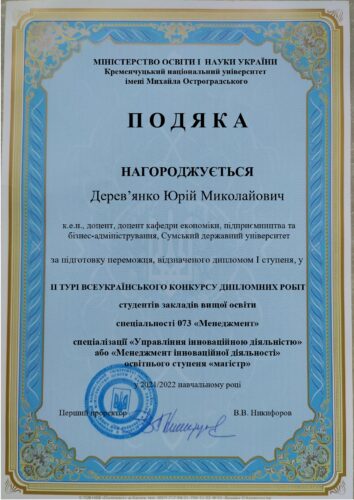 Студент нашої кафедри Парадісо Феліста Гаспер виборов І місце у ІІ турі Всеукраїнського конкурсу дипломних робіт серед студентів закладів вищої освіти спеціальності 073 «Менеджмент» спеціалізації «Управління інноваційною діяльністю» або «Менеджмент інноваційної діяльності» освітнього ступеня «магістр» у 2021/2022 навчальному році. Конкурс проходив на базі Кременчуцького національного університету імені Михайла Остроградського. Науковий керівник – доцент кафедри Юрій Миколайович Дерев’янко. Вітаємо студента та його наукового керівника з цією перемогою та бажаємо успішно працювати в цьому напрямі в наступних роках!