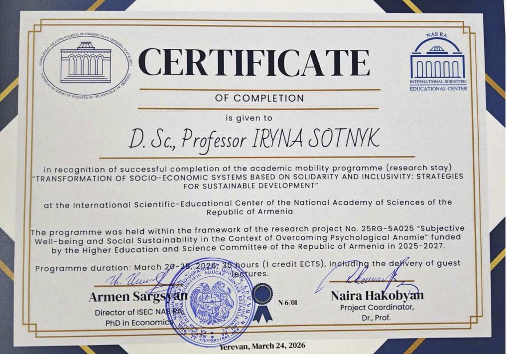 Протягом 19-29 березня 2026 року професорка кафедри, докторка економічних наук, професорка Ірина Сотник взяла участь у міжнародному науковому стажуванні на базі Міжнародного науково-освітнього центру Національної академії наук Республіки Вірменія (МНОЦ НАН РА).