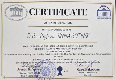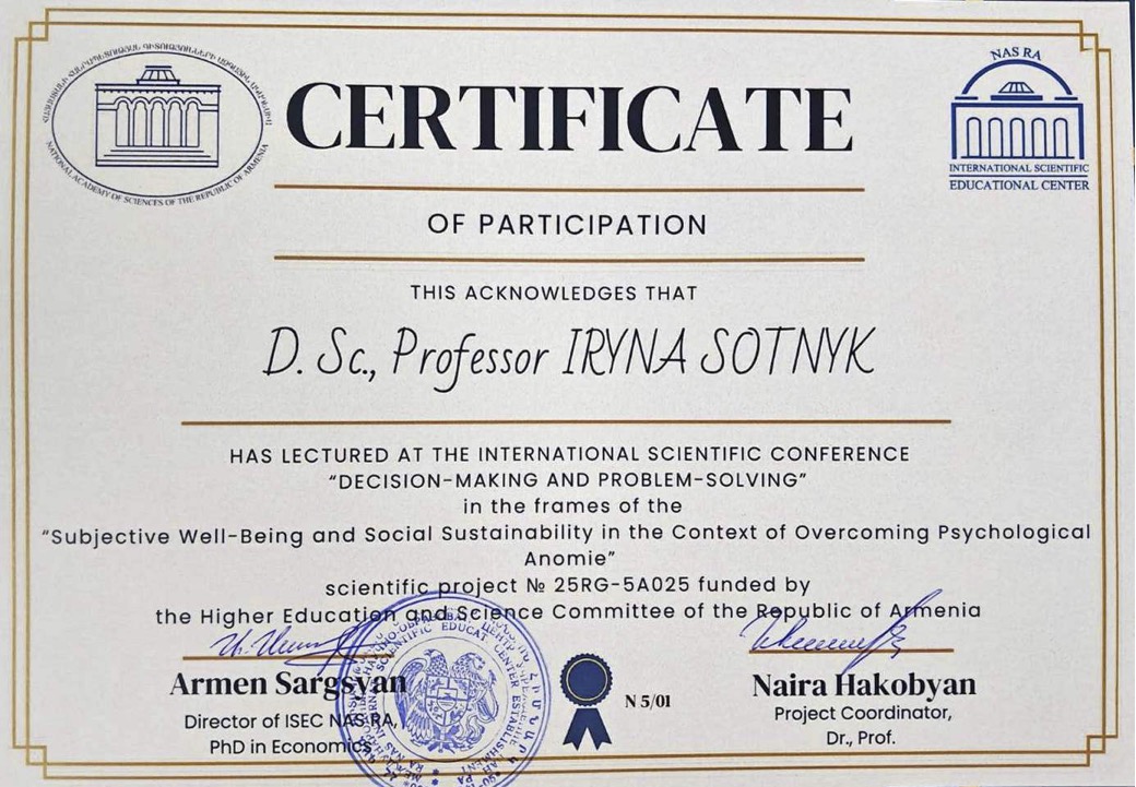 - координаційні зустрічі щодо реалізації спільного наукового проєкту №25RG-5A025 «Суб’єктивне благополуччя та соціальна стійкість у контексті подолання психологічної аномії», що фінансується Комітетом з вищої освіти та науки Вірменії.