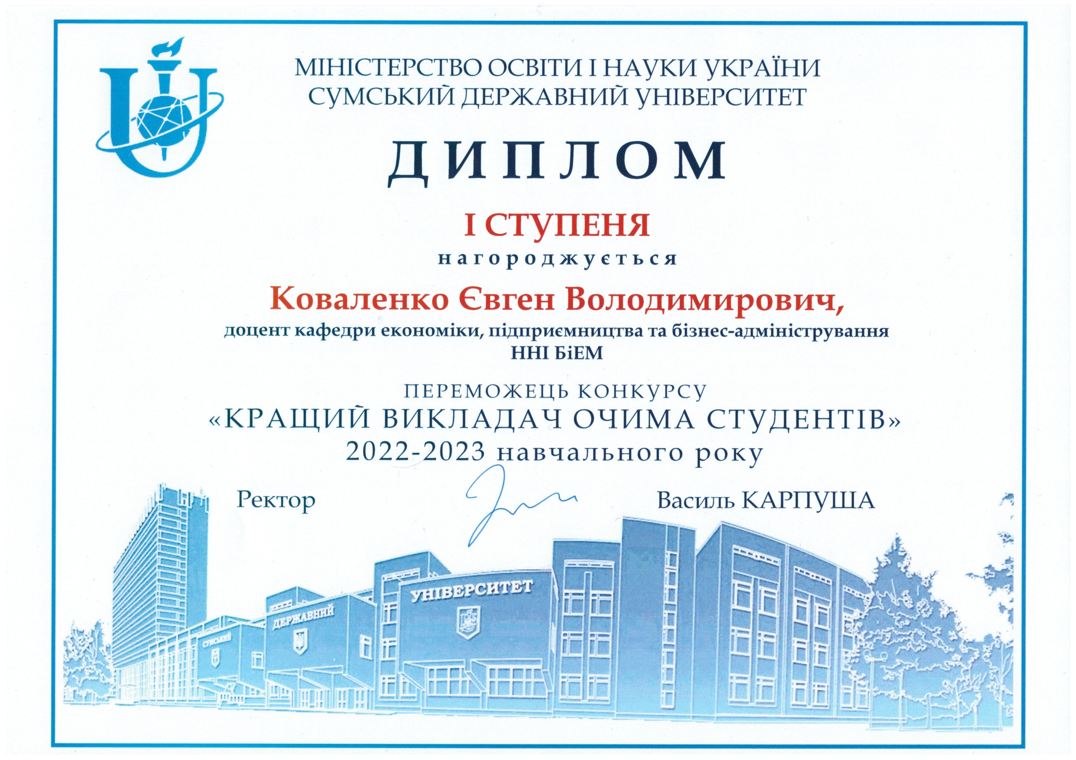 Диплом I ступеня переможця конкурсу «Кращий викладач очима студентів» (2022-2023 н.р., СумДУ)
