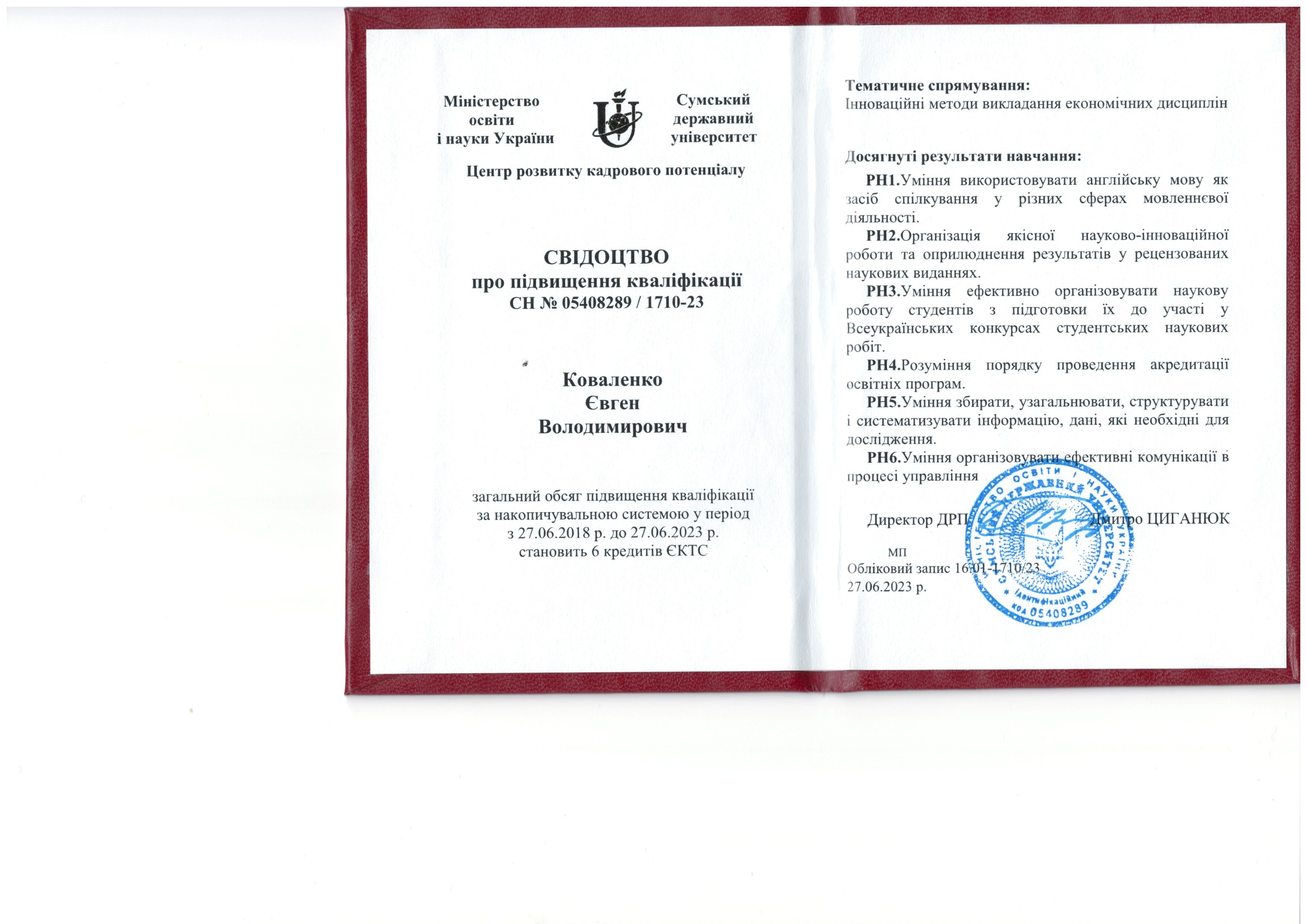 27.06.2023: Свідоцтво про підвищення кваліфікації СН № 05408289 / 1710-23. Тематичне спрямування: “Інноваційні методи викладання економічних дисциплін”