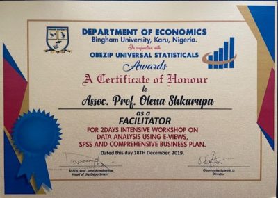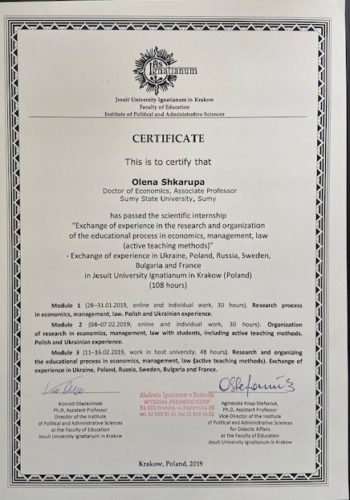 2. Сертифікати про міжнародне стажування: «Економічні основи сталого розвитку та «зеленої» економіки» (м. Каунас, Литва, 2016, 2017 рр.); «Економічний розвиток: досвід Норвегії» (м. Mo i Рана, Норвегія, 2017 р.).