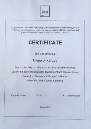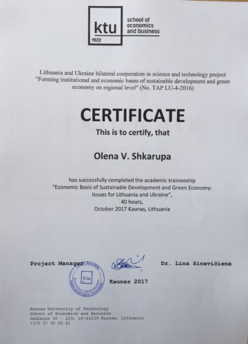 6. Стажування в Каунаському технологічному університеті “Економічні основи сталого розвитку та зелена економіка: проблеми для Литви та України” (2017 рік).