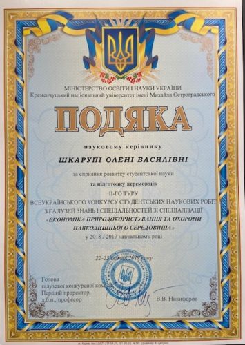 - Стрілецький С.В. – дипломи І ступеня (2009/2010 рр.) та Часник Ю.А. – диплом ІІ ступеня (2012/2013 рр.) Всеукраїнського конкурсу студентських наукових робіт з економіки природокористування та охорони навколишнього середовища;