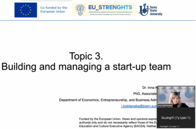 Вже на перших лекціях студенти мали змогу дослідити особливості функціонування стартап екосистеми в ЄС та Україні, дізнатися про можливості фінансування стартапів в ЄС, а також вивчили основні принципи побудови команди та дизайну мислення. Курс викладається англійською мовою для студентів з України та КНР, загальним обсягом 40 аудиторних годин. Викладачем курсу є к.е.н., доцент кафедри та керівник проєкту Інна Коблянська.