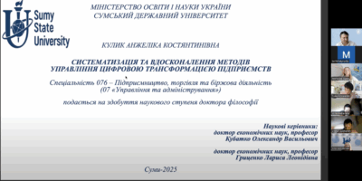 29 серпня 2025 року на засіданні разової спеціалізованої вченої ради Сумського державного університету відбувся захист дисертації Кулик Анжеліки Костянтинівни на здобуття наукового ступеня доктора філософії з галузі знань 07 «Управління та адміністрування» за спеціальністю 076 «Підприємництво, торгівля та біржова діяльність».